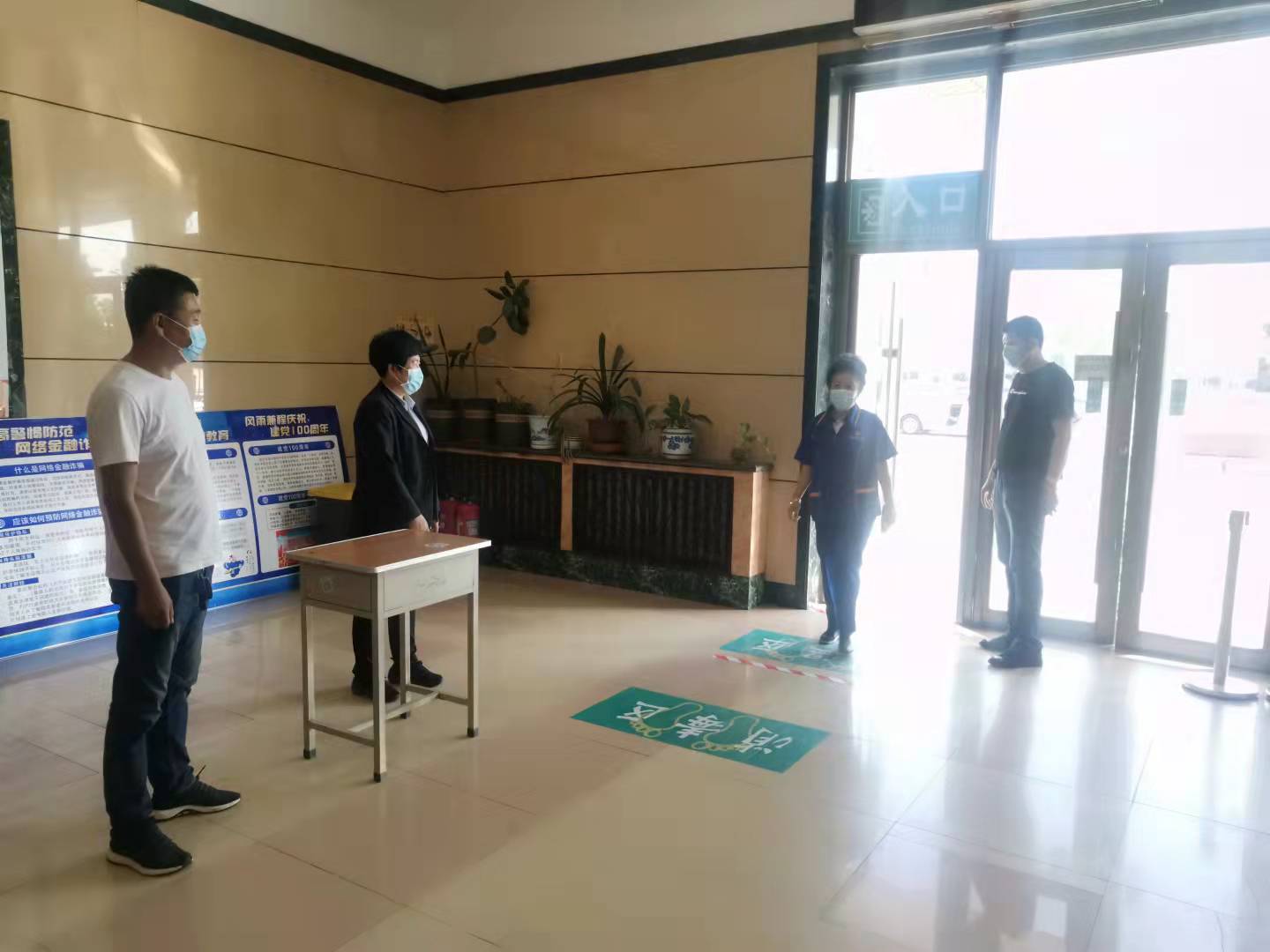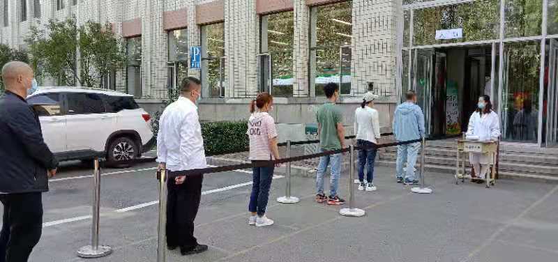 所有人员在食堂指定入口按照工作人员指挥按一米标示线排队等进行体温检测