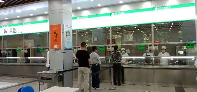 售饭窗口前标注一米标示线和出口指示,打饭学生按照标示线和工作的引导到相应售饭窗口有序排队打餐