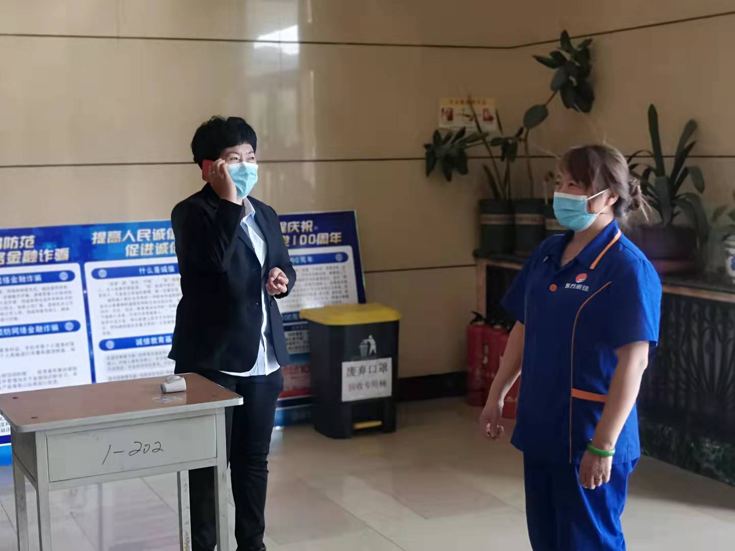 随后,校园管理科在经管楼模拟了在晨检时发现保洁人员体温异常的场景。