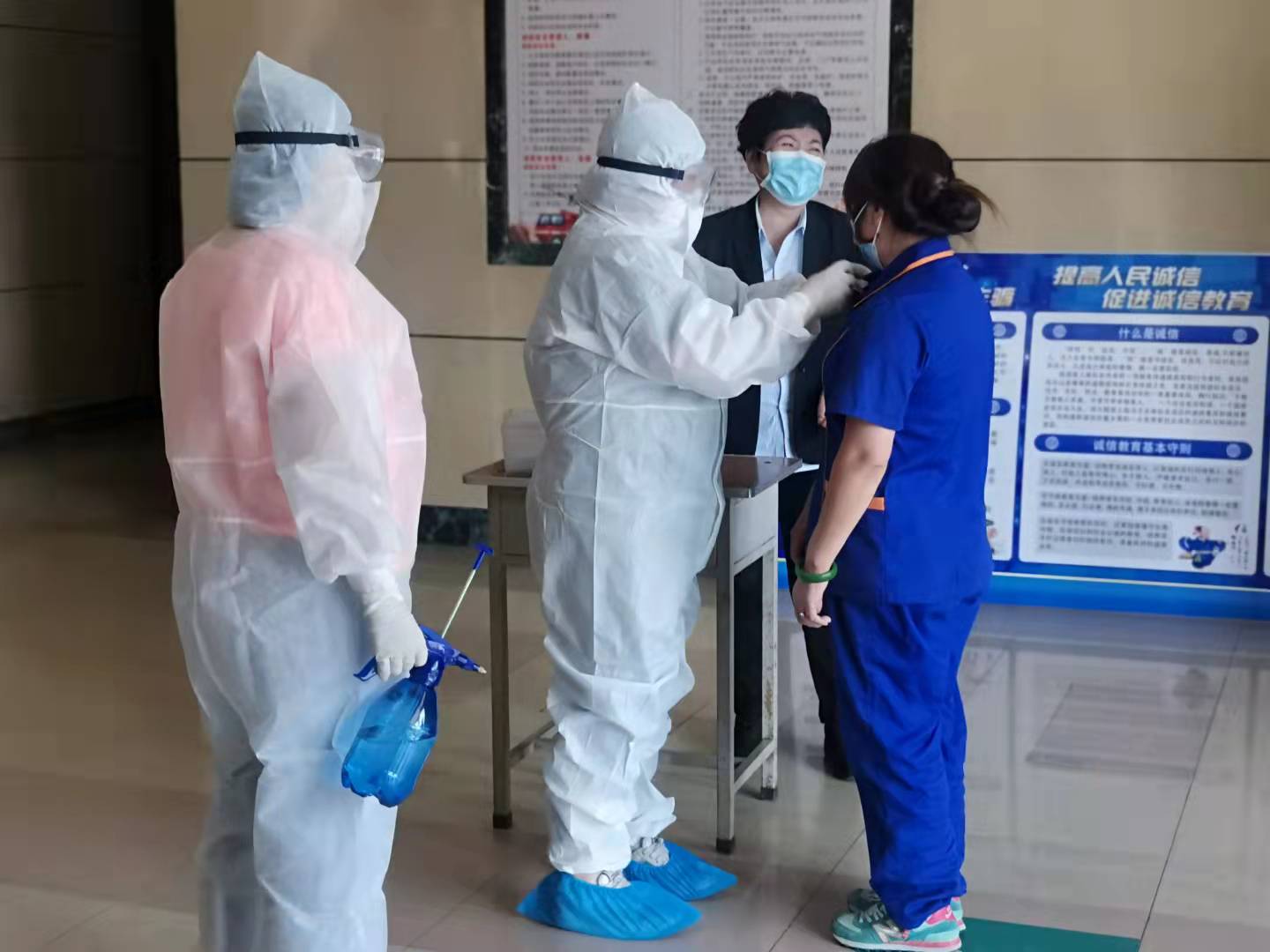 医护人员对保洁员进行体温复测,对现场进行消杀