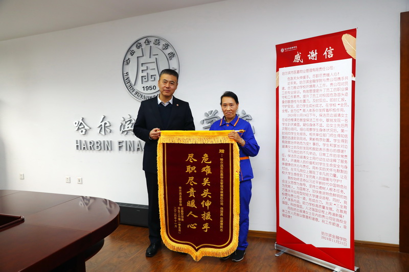 黄强表示,哈尔滨医嘉物业管理有限责任公司将优秀企业文化融入学校发展建设,边淑清同志的善举是个人素质和企业文化共同发力的结果,公司对员工的专业培训、有效管理提升了员工的职业操守和工作素养,在学校“三全”育人体系中发挥着积极作用。希望校企双方进一步深入协作,为学校高质量发展、为时代新人培养贡献更大力量。同时,号召全体教职员工形成合力,不断充实“三全育人”体系内涵,助力学校高质量发展,为培养有理想、敢担当、能吃苦、肯奋斗的新时代好青年贡献智慧和力量。