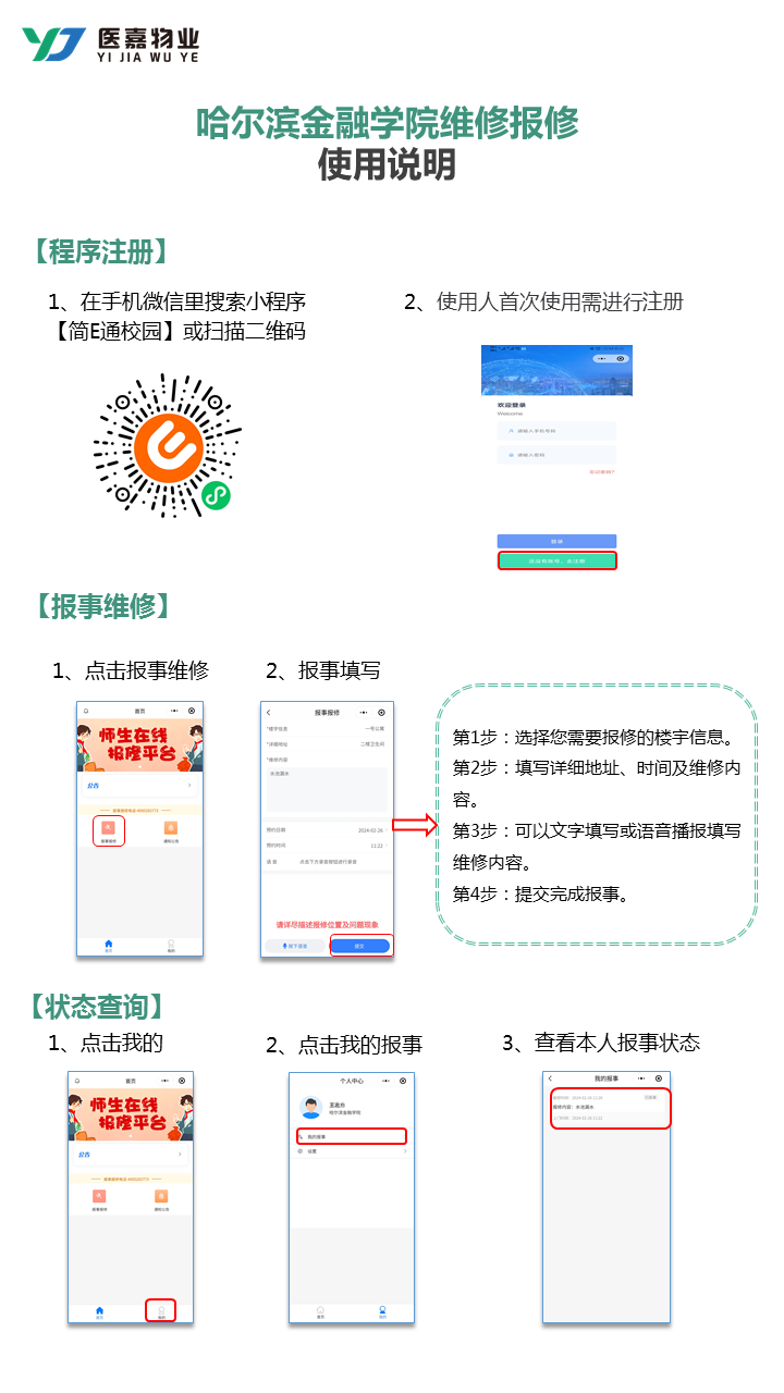 为及时、有效的维修学校基础设施,切实为学校师生提供优质服务。我校将校园维修服务外包给新中标的医嘉物业公司。根据合同约定,今后校园维修事宜将采用信息化方式开展,请参照以下说明使用。