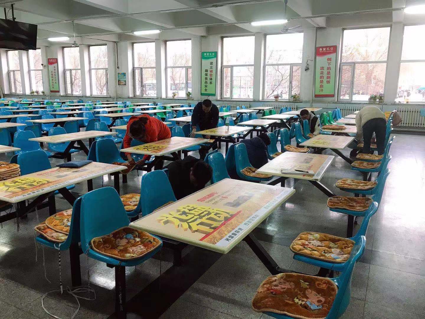 2019年11月7日下午,党员们来到第二食堂一楼,有序地按照餐桌的座位逐一把爱心坐垫进行捆绑。后勤管理处直属党支部全体党员为师生办一件实实在在的好事,营造了一个温暖舒适的就餐环境。