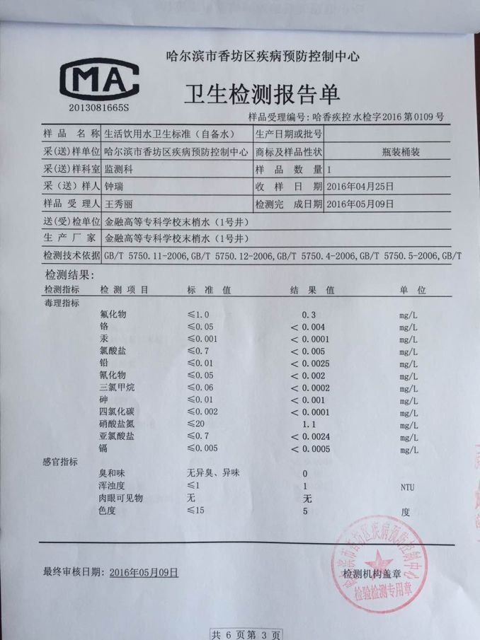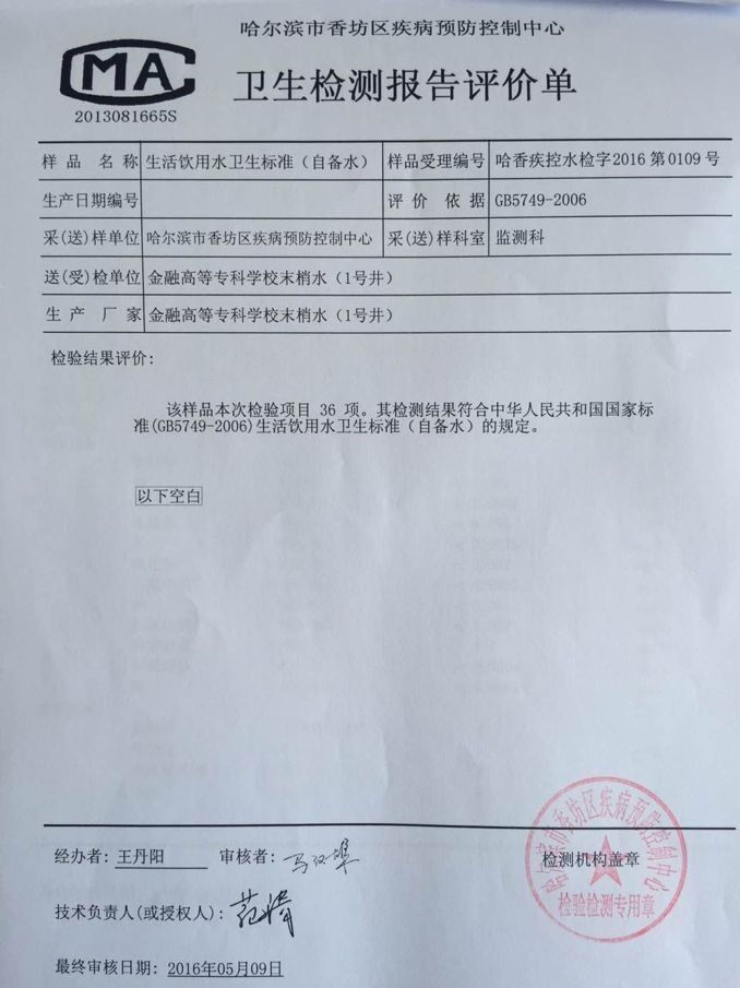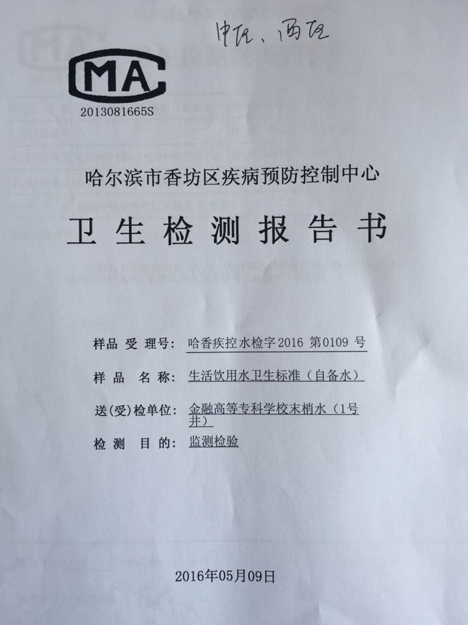 哈尔滨金融学院生活饮用水卫生检测报告(中区、西区1号井)